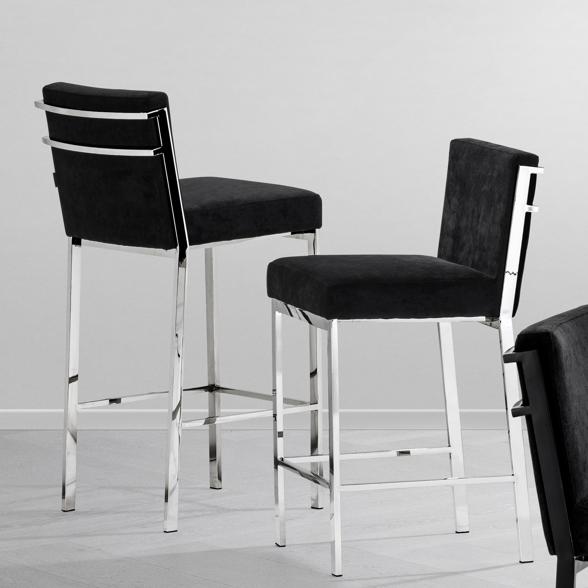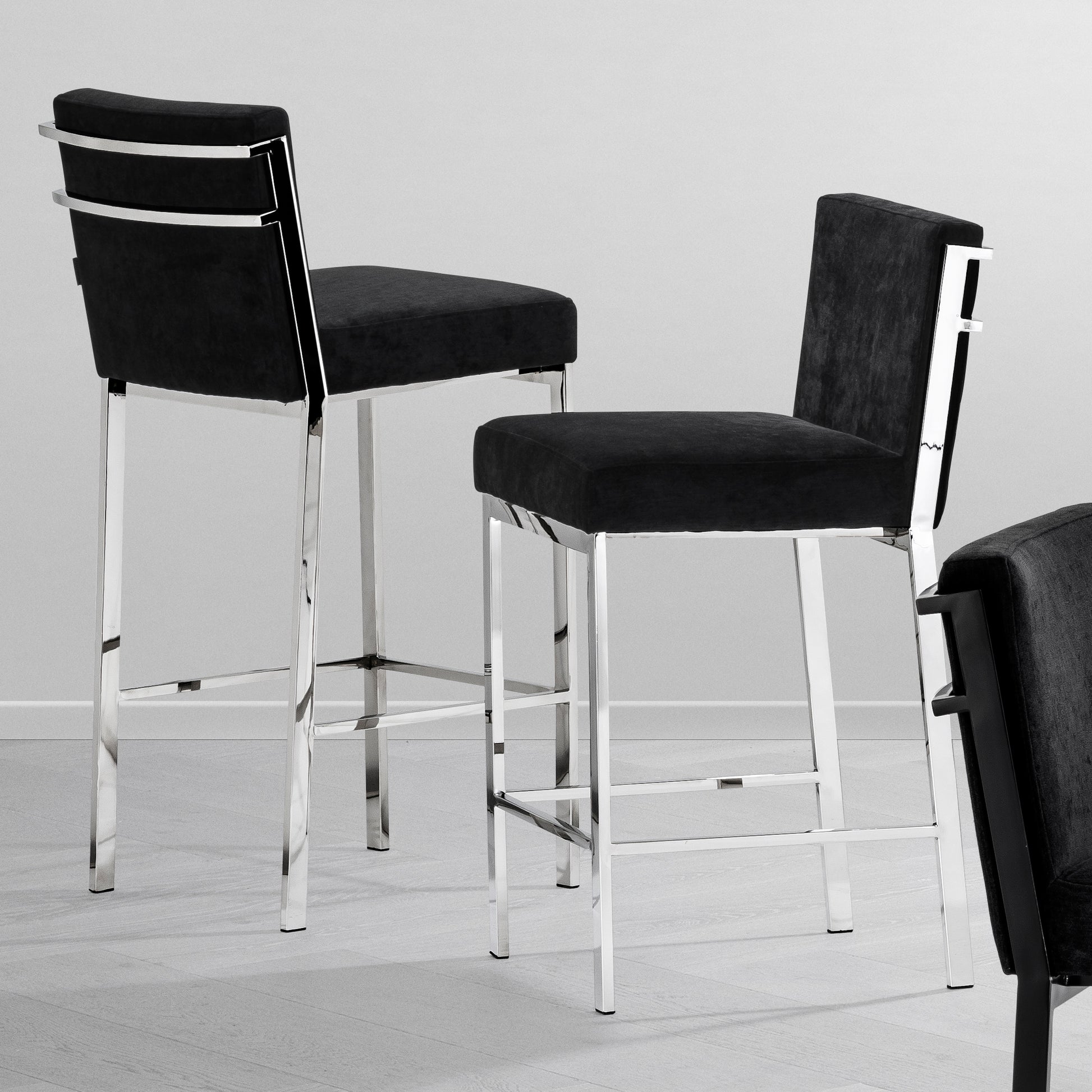 Bieten Sie Ihrer lässigen oder formellen Lounge- oder Esszimmerausstattung mit dem luxuriösen Barhocker Scott eine stilvolle Wendung. Sein polierter Edelstahlrahmen mit Fußstütze verleiht Ihrem modernen Design Glamour und Raffinesse, während sein schwarzer Samtsitz ein komfortables Sitzerlebnis bietet.