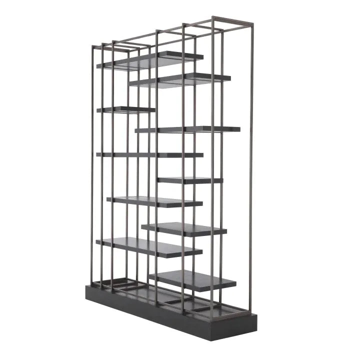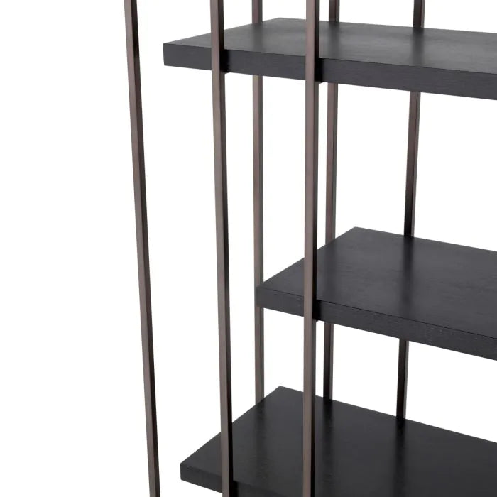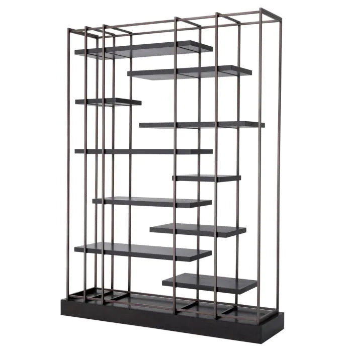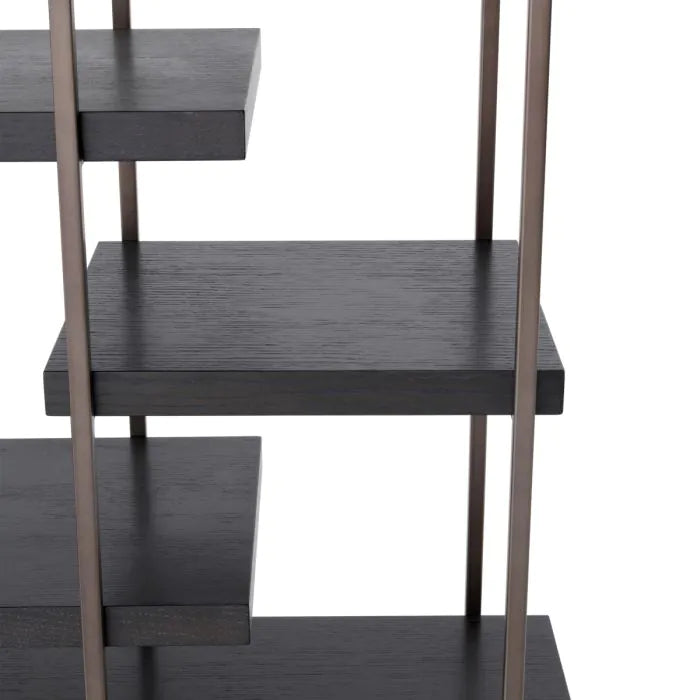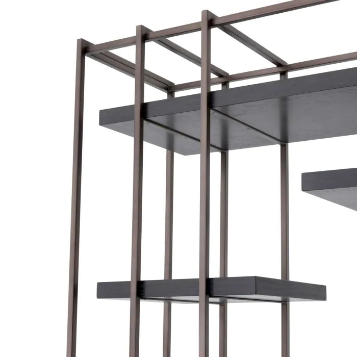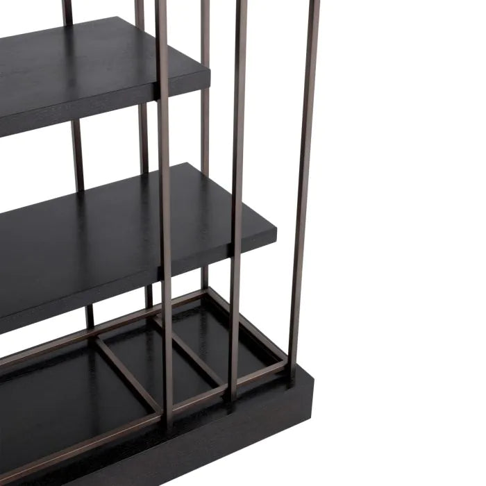 Das Regal Ward strahlt architektonischen Charme aus und fühlt sich sowohl in Vintage-Dekoren als auch in zeitgenössischen Inneneinrichtungen zu Hause. Dieses geradlinige Designerregal ruht auf einem robusten Sockelsockel. Sein durchbrochenes Gehäuse besitzt ein Bronze-Finish und enthält frei fließende Eichenfurnier-Regalböden.