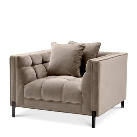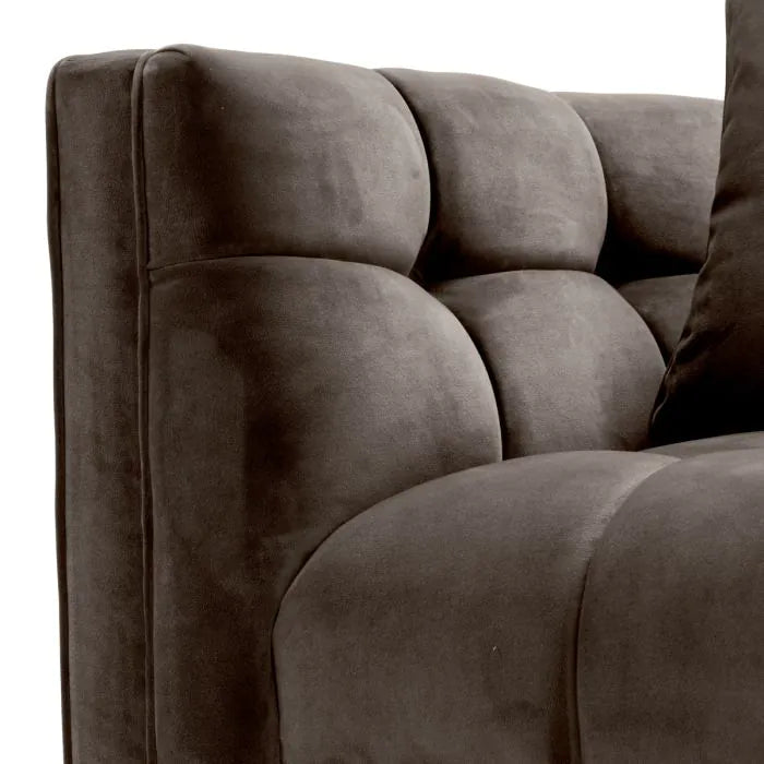 Der prächtige Sessel Sienna verbindet Komfort mit High-Style. Die Rückenlehne ist t-förmig und bildet eine Einheit mit den Armlehnen. Dieser elegante, moderne Sessel ist mit einer getufteten Polsterung aus weichem, grauem Savona-Samt und zwei quadratischen Kissen ausgestattet. Beine mit Goldfinish verleihen dem luxuriösen Look zusätzlichen Glamour