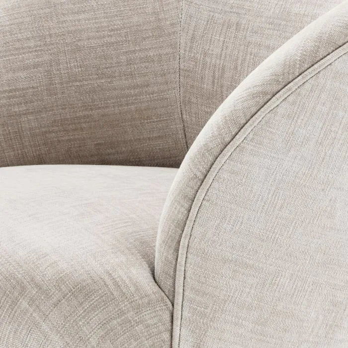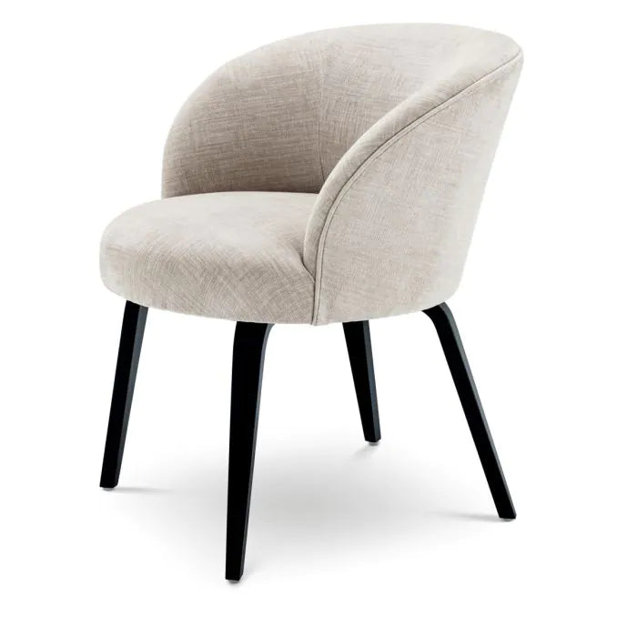 Mit seinen schlanken schwarzen Beinen und der eleganten Sisley-Bezug in Beige verbindet dieser charmante Stuhl Komfort mit einem Hauch von Retro-Charme.