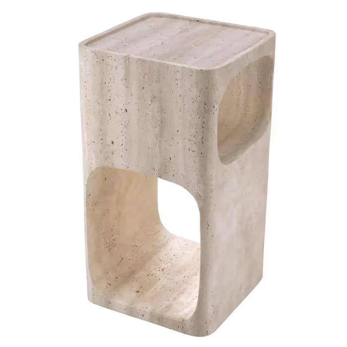 Der Beistelltisch Adler ist aus einem massiven Stück Travertin geschnitten, was jedes Stück zu einem echten Unikat macht. Dieser vielseitige Akzenttisch im modernen Stil der Mitte des Jahrhunderts bietet zwei Ablageebenen unter einer Tischplatte mit erhöhtem Rand.