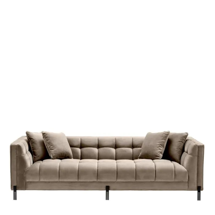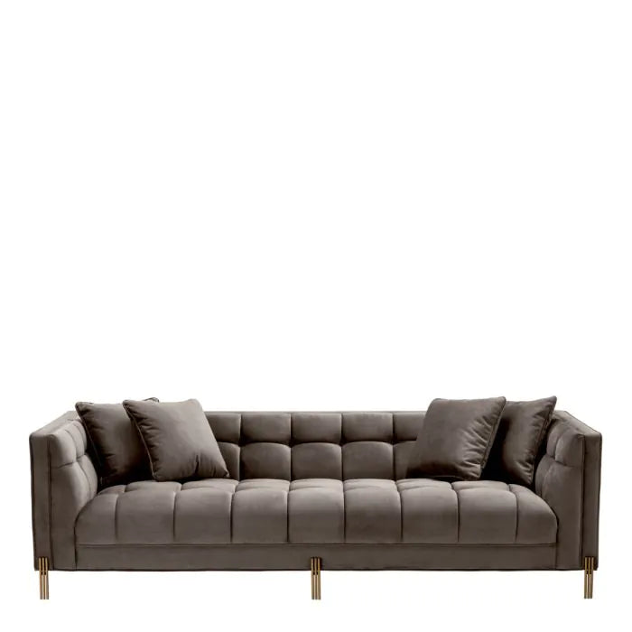Produktinformation: Das prächtige Sofa Sienna verbindet Komfort mit High-Style. Die Rückenlehne ist t-förmig und bildet eine Einheit mit den Armlehnen. Dieser elegante, moderne Sessel ist mit einer getufteten Polsterung aus weichem, grauem Savona-Samt und vier quadratischen Kissen ausgestattet. Beine mit Goldfinish verleihen dem luxuriösen Look zusätzlichen Glamour.